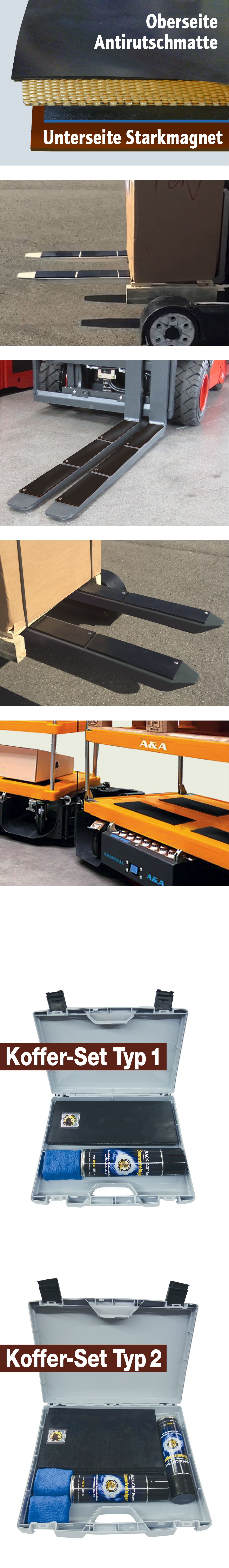 Federt Stöße ab und sorgt für leiseres Handling beim Be- und Entladen. - einfache Anwendung: Streifen mit der Starkmagnetschicht nach unten auflegen – fertig! Lagerung einfach am Staplerholmen, an geraden Metallflächen oder im mitgelieferten Koffer.