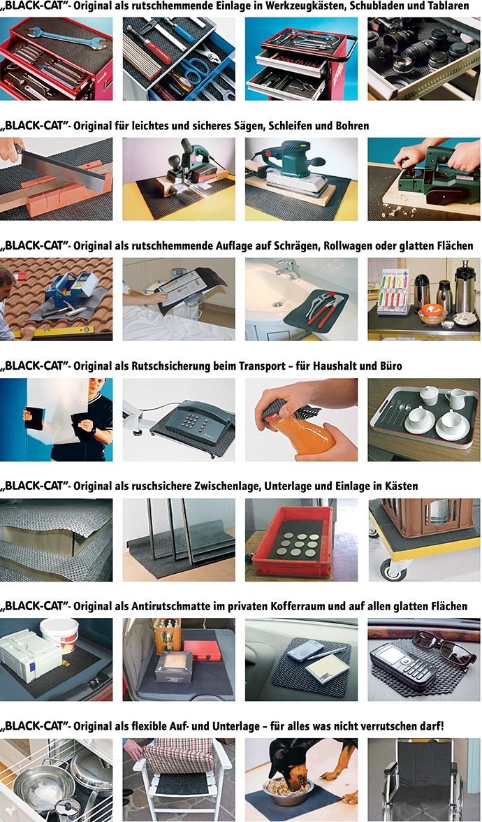 BLACK-CAT Original ist die universelle Antirutschmatte für 1000-fachen Einsatz in allen Bereichen des täglichen Lebens. Ob in der Werkstatt, im Handwerk, Industrie oder Verkehr, ob im Büro oder im Haushalt.