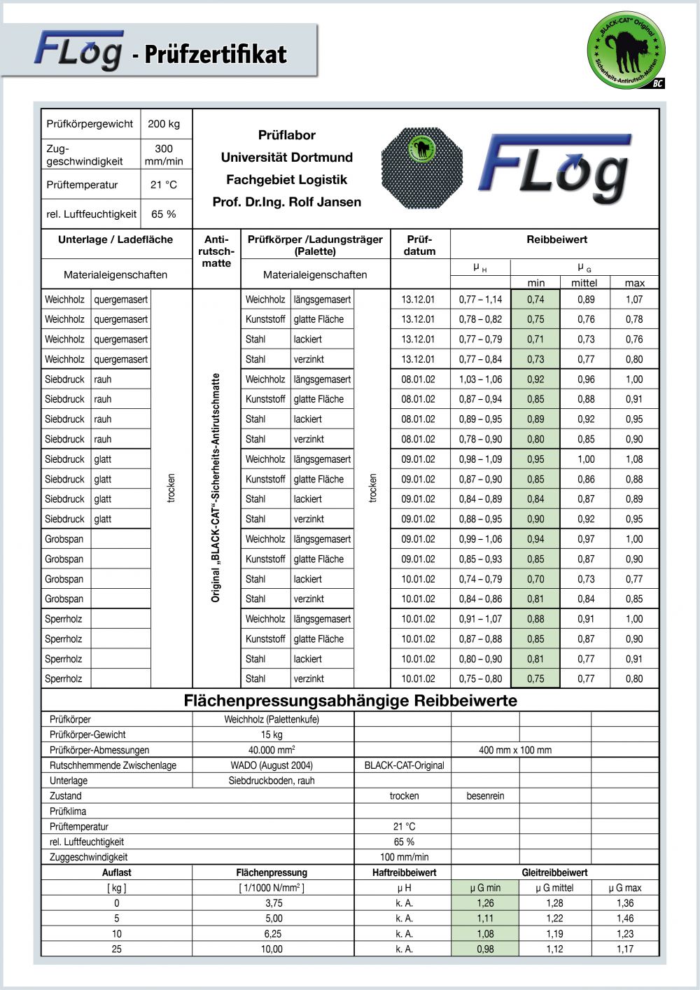 Prüfzeugnisse sind für die Information des Anwenders zur genauen Ermittlung der gesetzlichen Vorgaben in der Ladungssicherung. Prüfzeugnisse sind nicht auf andere Antirutschmatten übertragbar.